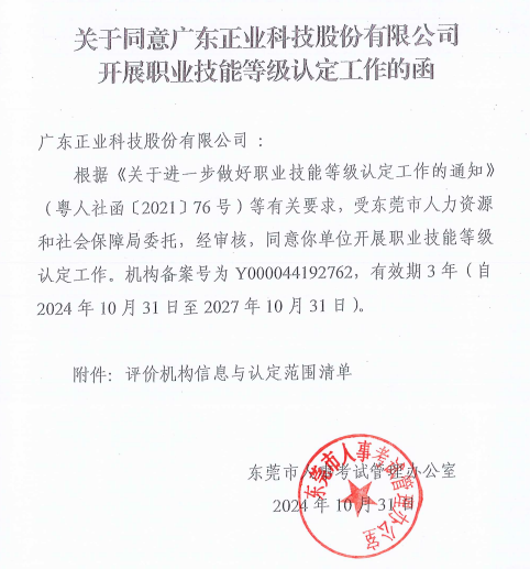 近日,广东丝瓜视频下载地址科技股份有限公司(以下简称:丝瓜视频下载地址科技)收到了东莞市人事考试管理办公室“关于同意广东丝瓜视频下载地址科技股份有限公司开展职业技能等级认定工作的函”。这标志着公司顺利完成了职业技能等级认定备案工作,开启了公司技能人才队伍培养与认定的新篇章。